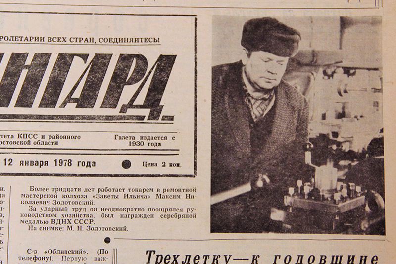 В номере за 12 января 1978 года «Авангард» пишет о токаре ремонтной мастерской колхоза «Заветы Ильича» Максиме Николаевиче Золотовском. Как отмечено в заметке, М.Н.Золотовский на тот момент проработал в мастерской 30 лет, за ударный труд он неоднократно поощрялся руководством хозяйства, а также был награжден серебряной медалью ВДНХ СССР.