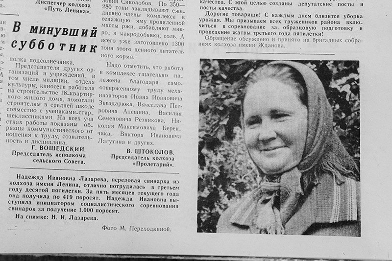«Надежда Ивановна Лазарева, передовая свинарка из колхоза имени Ленина, отлично потрудилась в третьем году десятой пятилетки», - говорилось в очередной публикации «Авангарда». Сообщается, что за пять месяцев 1978 года Н.И.Лазарева получила по 419 поросят и выступила инициатором социалистического соревнования свинарок за получение 1000 поросят.