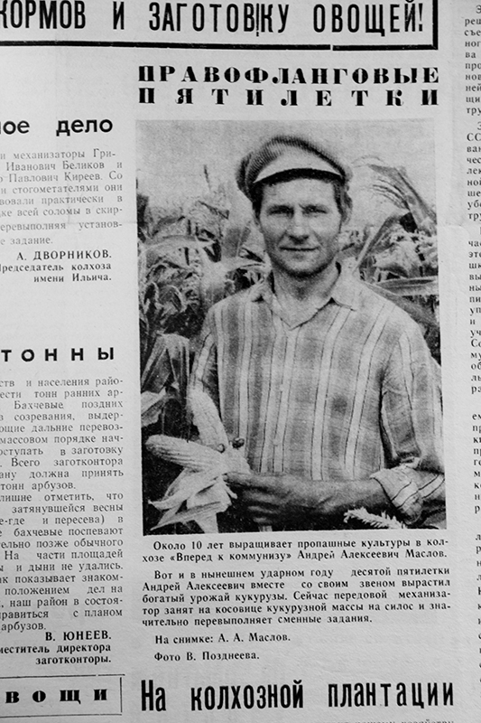 Герой очередной публикации – механизатор колхоза «Вперед к коммунизму» Андрей Алексеевич Маслов - вместе со своим звеном вырастил богатый урожай кукурузы. В информации об этом также сообщается, что в те дни А.А.Маслов был занят на косовице кукурузной массы на силос и значительно перевыполнял сменные задания.