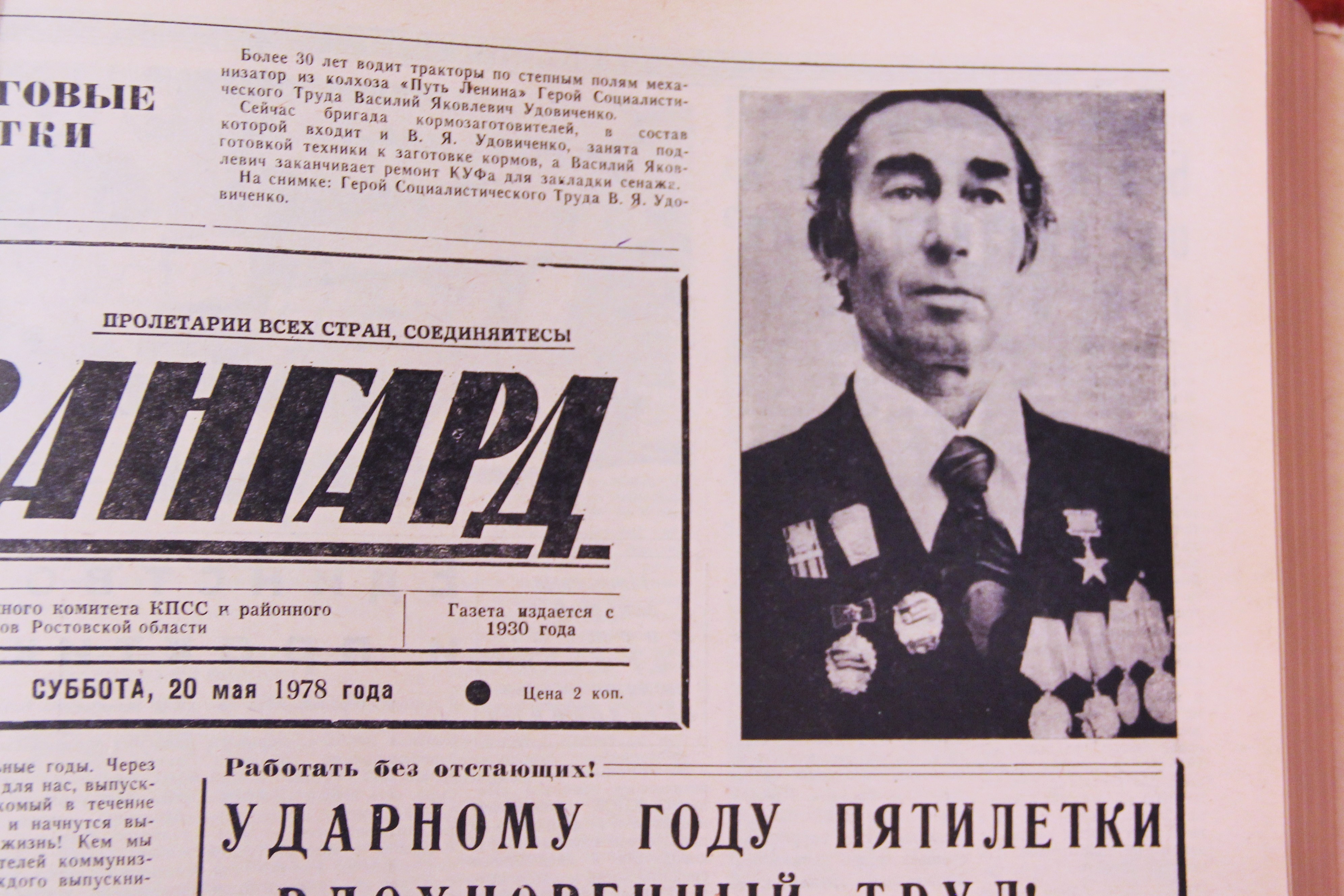 В субботнем номере от 20 мая 1978 года напечатан портрет механизатора колхоза «Путь Ленина», Героя Социалистического труда Василия Яковлевича Удовиченко. К тому времени его стаж в профессии составлял более 30 лет. В публикации рассказывалось о том, что бригада кормозаготовителей, в которой работал В.Я.Удовиченко, готовит технику к заготовке кормов, а сам Василий Яковлевич заканчивает ремонт КУФа для закладки сенажа.