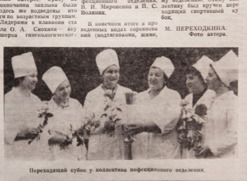 В июне 1988 года медики Обливской ЦРБ к профессиональному празднику устроили между собой соревнования по сдаче норм ГТО. Об этом интересном событии подробно рассказала районная газета в выпуске от 18 июня. После подведения итогов по всем видам соревнований – подтягиванию, жиму, бегу и плаванию – первое место было присуждено инфекционному отделению. Работникам отделения был вручен переходящий спортивный кубок (на снимке).