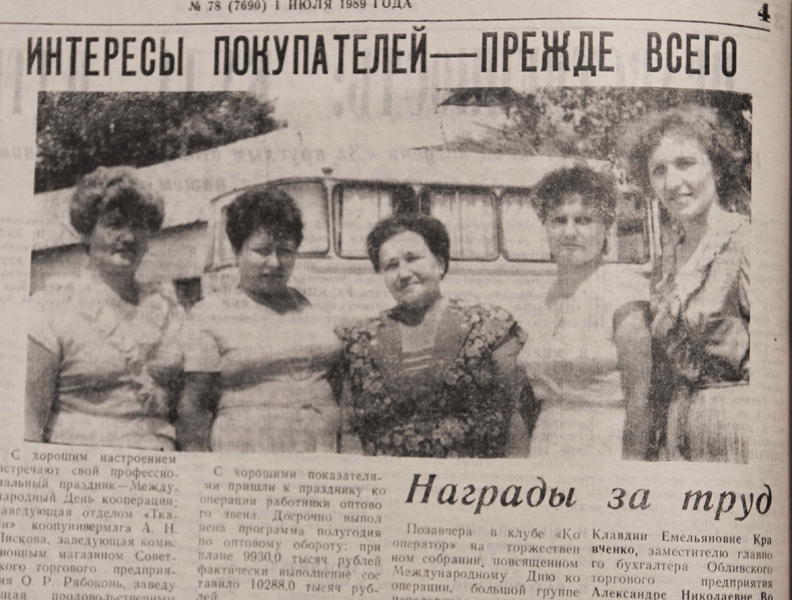 Одна из полос «Авангарда» за 1 июля 1989 года была посвящена Международному Дню кооперации. На групповой фотографии – работницы потребительской кооперации района: заведующая отделом «Ткани» коопунивермага А.Н.Пискова, заведующая комиссионным магазином Советского ТП О.Р. Рябоконь, заведующая продмагом Обливского ТП О.И.Безверхова, заведующая магазином хутора Сеньшина В.В.Пчельникова, заведующая магазином Паршинского кооппредприятия Н.К.Голубович.