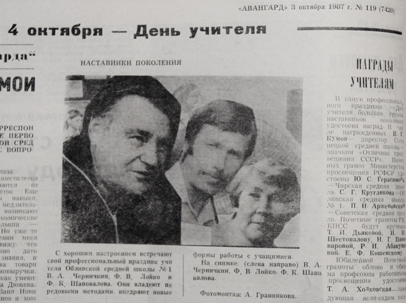 «С хорошим настроением встречают свой профессиональный праздник учителя Обливской средней школы №1 В.А.Черничкин, Ф.В.Лой-ко и Ф.К.Шаповалова», - сообщал «Авангард» от 3 октября 1987 года. Заметка, в которой отмечалось, что педагоги владеют передовыми методами и внедряют новые формы работы с учащимися, проиллюстрирована коллажем из портретов.