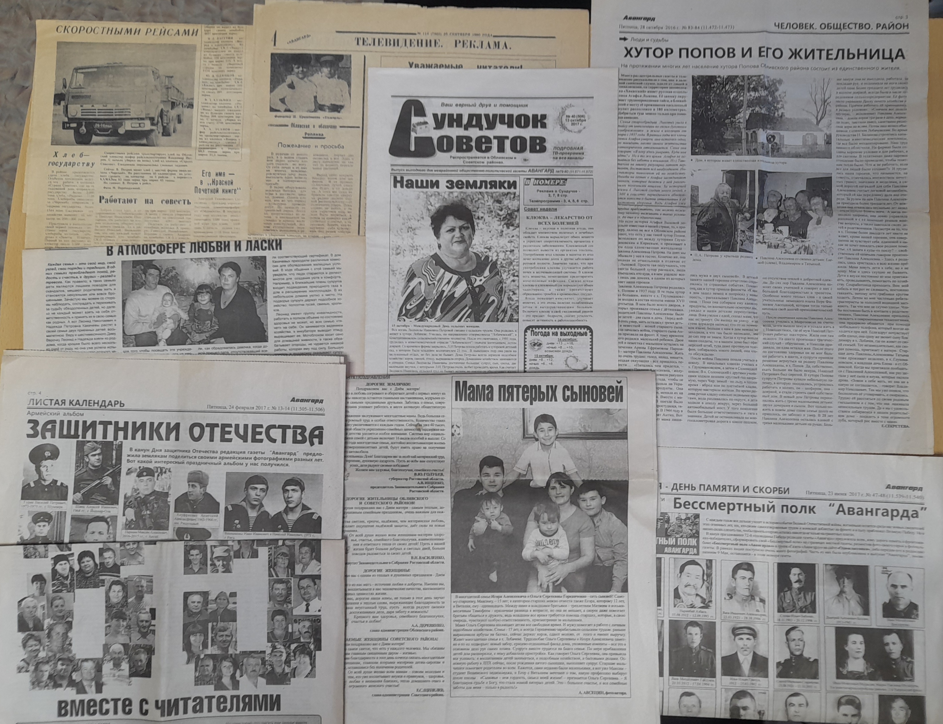 Почему я их храню? Да много причин! Самому «пожилому» номеру 45 лет – ровно столько, сколько живем в браке с моим мужем Владимиром Николаевичем Петровым. А газетку храню с его фото и статьей, когда он ударно работал тогда еще в райсельхозтехнике. И еще несколько газет – все о нем. Вот номер с юбилеем районки – 85 лет, это 2016 год. Есть газета, где сынок с другом - «казачата» (1990 год – ему 6 лет, а сейчас уже 42). Потом в «Авангарде» пошли внучки, одна с отличием окончила музыкальную школу, и есть фотографии и заметки об их концертах и конкурсах. Другая внучка – в фотоконкурсе «Поделись улыбкою своей». Как же эти выпуски не сохранить! Есть газета – Бессмертный полк «Авангарда». Храню потому, что там фото наших земляков, а также номер «Защитники отечества», где тоже фото наших ребят, к сожалению, некоторых нет в живых (Максим Абросимов, погиб на СВО). Много газет с фотографиями многодетных семей нашего хутора, воспитывающих 3, 4 и 5 детей: Горкавченко – наши соседи – 5 сыновей у них; Какичевы – это племянница мужа – там мы видим двоих детей, но они взяли еще одного и теперь у них трое – приемных.
