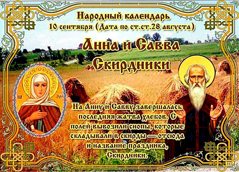 10 сентября (по старому стилю 28 августа) по народному календарю - Анна и Савва Скирдники. На Руси Анну и Савву завершалась последняя жатва хлебов. С полей вывозили снопы, которые складывали в скирды — отсюда и название праздника - Скирдники.
